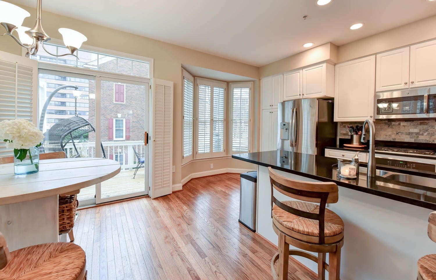 Located in North Old Town and only one block to bike trails and the waterfront, this beautiful brick end unit townhome offers four lovely finished levels. Gleaming hardwood floors, plantation shutters, crown molding, classic chair rail and recessed lighting complete most rooms. A den/office space on the entry level is showcased by its marble floors. On the main level, the ceilings are high, the rooms are bright and open and there is easy flow which will make entertaining comfortable. A gorgeous chef’s kitchen features new stainless appliances, a gas cooktop, black granite counters, a light-filled bay window, and sliding door access to a charming deck. Moving to the first upper level, the Master suite is spacious, has a gracious walk-in closet and a stunning updated luxury bathroom with marble floor, walk-in shower and a soaking tub. The second bedroom on this level is a comfortable size with a walk-in closet and the hallway bath has been updated. The expanded 4th floor is the home’s third bedroom and has a full bath. This is a great, flexible space for guests to stay and have ample privacy or to use for a home office, rec room or play room. The exterior of the home is well maintained and has a desirable two car garage and driveway. Living at 1113 N. Royal offers an easy commute to DC and only a short walk to all of Old Town’s shopping and dining. With a close-knit community where neighbors often gather for friendly get-togethers, life at 1113 N. Royal is truly ideal.