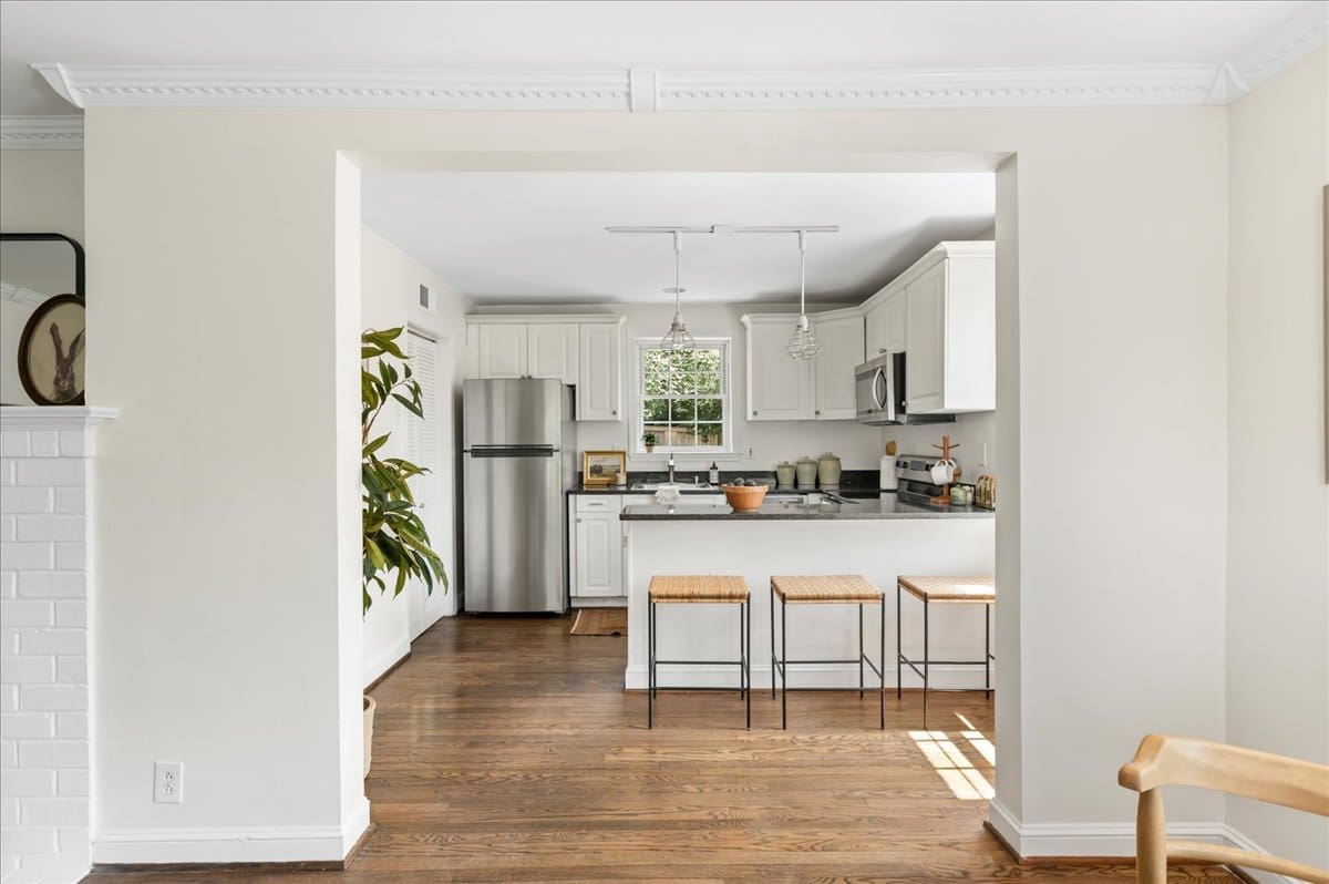 Charming abode tucked away in a neighborhood right outside of historic Old Town. Centrally located with effortless access to all you could need; public transportation (walk to metro) and interstate highways to ease your commute, everyday living essentials for added convenience, delicious restaurants, and local parks/trails that compliment any lifestyle. Cross the threshold of 127 Hilton Street and immediately fall in love! Fantastic one-level living option, if needed with two bedrooms and one full bathroom. The main level is open and bright and features a combination living/dining space that comfortably transitions from day-to-day activities to accommodating gatherings with friends and family. This space is grounded by the original wood-burning fireplace with mantel and rustic brick surround and flows into a modernized kitchen where you will enjoy ALL NEW (Never used) stainless appliances, a breakfast bar (room for 3 or 4 stools) ideal for food prep or catching quick meals, granite countertops, contemporary lighting, and plenty of cabinet storage. Louvered doors within the kitchen lead to a utility room that doubles as a passageway to the fantastic fenced backyard retreat with a brick patio, professional landscaping, a six-foot tall privacy fence, and a shed for all lawn maintenance items. Moving any gatherings from inside to the lovely outdoor space will become second nature in the warmer months. The second level of the home is comprised of two spacious bedrooms, ample storage/closet space, and a large updated bathroom that holds the washer and dryer. One of these bedrooms makes a great office opportunity if desired. Lots of street parking is available for you and your guests, with no permits required. Additional perks include a freshly painted interior completed in August 2022, hardwood floors, plush carpet, dentil crown molding, a new roof, gutters, and HWH installed in 2019, and the furnace and HVAC replaced in 2017.