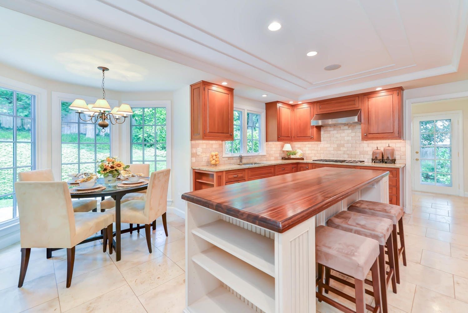 - Showstopper kitchen renovation with Travertine floors, tray ceiling, custom cabinets and Brazilian wood top island, built-in speakers, bay window breakfast nook, granite counters, marble backsplash, under-counter lights, top of the line stainless appliances (Dacor, Thermadore, SubZero, GE Monogram, Wolf, Miele), prep sink, 2 disposers, double ovens and 2 pantries