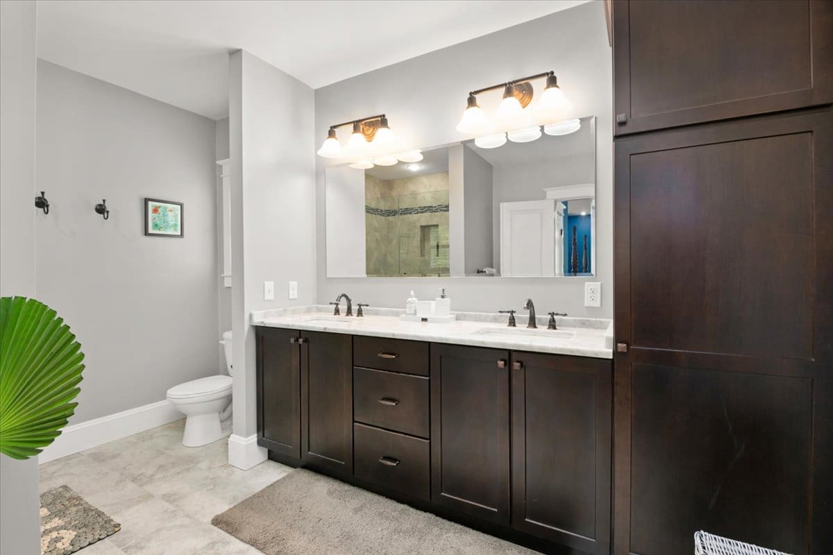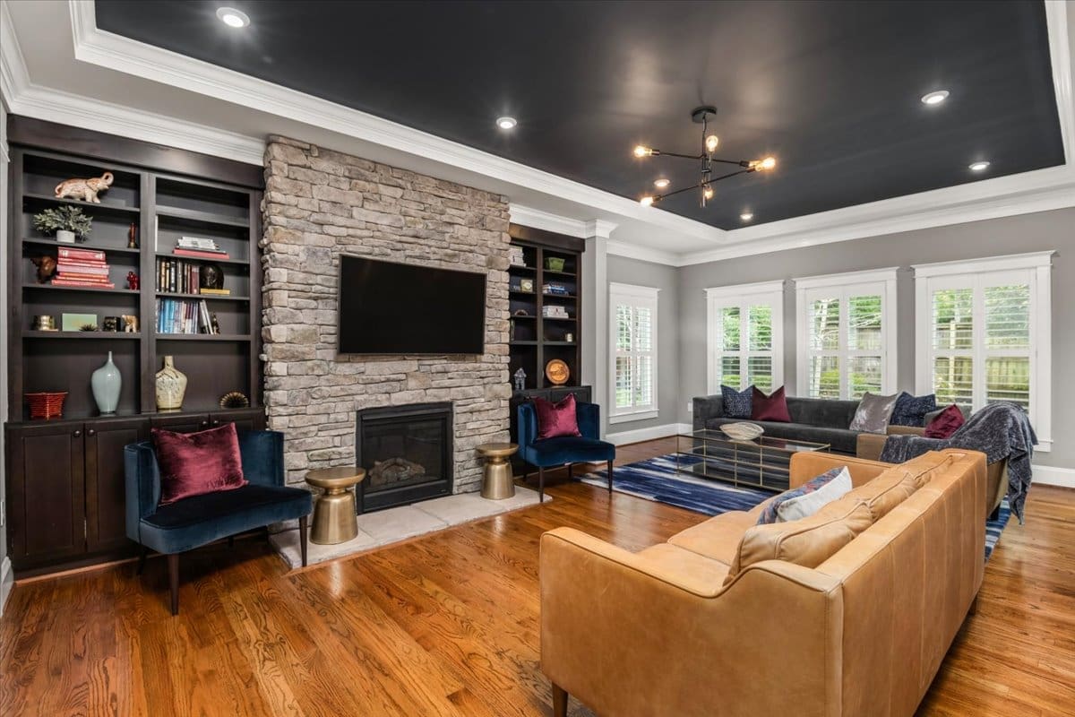 Crossing the threshold, you’ll immediately appreciate the impact of the 9-foot + ceilings, warm wood floors, neutral paint colors, and crisp crown molding. The refined dining room features a rich wall of color, showcasing a beautifully displayed tray ceiling, providing a wonderful setting for special occasions. A brilliant living room is perfect for everyday relaxation or spacious for entertaining. It presents built-in shelves/cabinets for collections and is anchored by a gas fireplace with floor-to-ceiling stone surround. The gorgeous gourmet eat-in kitchen is designed with foodies and entertainers in mind. It boasts a clean aesthetic and provides all you would need; a cozy desk, ample cabinet/drawer storage, under cabinet lighting, white subway tile backsplash, top of the line stainless appliances (Thermador), honed black granite countertops, walk-in pantry, and the large center island with breakfast bar (which fits four stools). And there is more! A built-in microwave, two cookbook bookcases, and a wine cooler complete the kitchen. The breakfast nook is illuminated by a dramatic light fixture and, like the family room, has sliding glass doors that lead to a back deck that flaunts a retractable awning. Having the option to gather with friends and family inside or out, rain or shine will make this summer season so much sweeter! The home offers two primary bedrooms. The first is conveniently located on the main level perfect for those who need one level living, now or in the future. This dreamy space is complete with a luxurious en-suite bath with double vanity, a spa-inspired shower, and a deep walk-in closet.