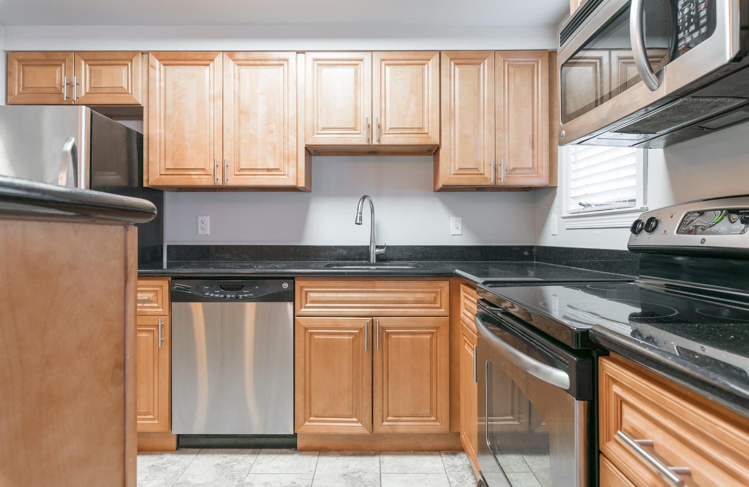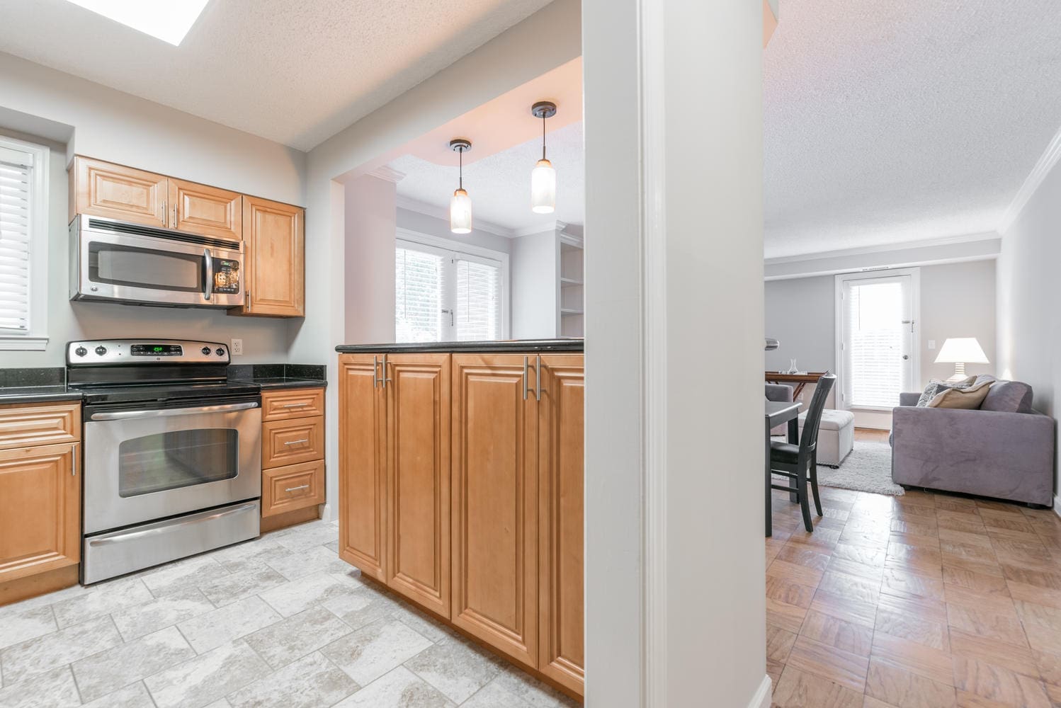 - Updated kitchen (cabinets, granite countertops, appliances, floor, lighting) Cut out wall to make open kitchen and semi-island/breakfast bar area with pendant lights that match cabinets and kitchen well