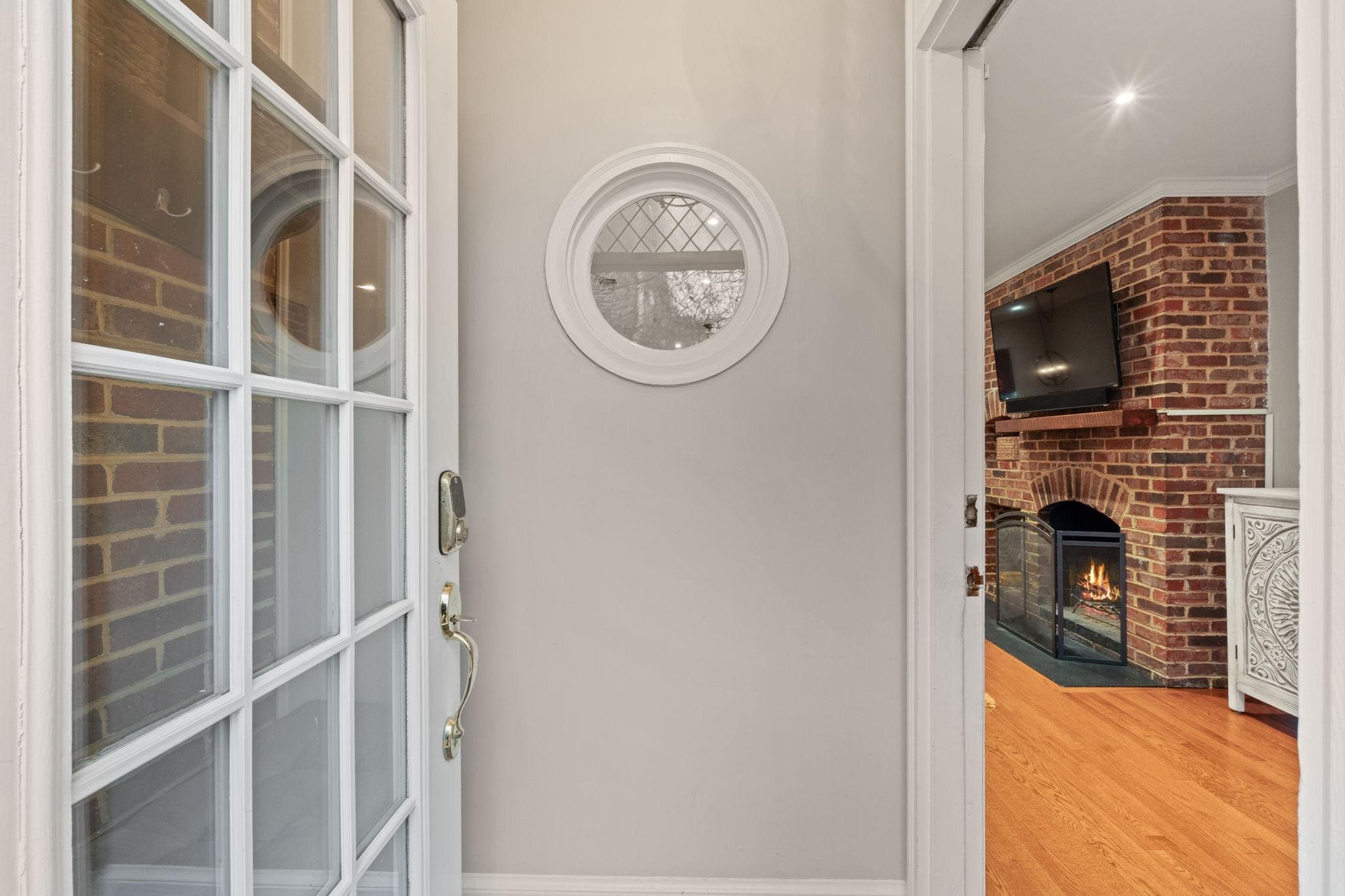 Step inside to a warm and welcoming living room, where hardwood floors, crown molding, and a cozy window seat create a timeless appeal. The wood-burning fireplace provides the perfect spot to unwind, while exposed brick accents add character and charm.