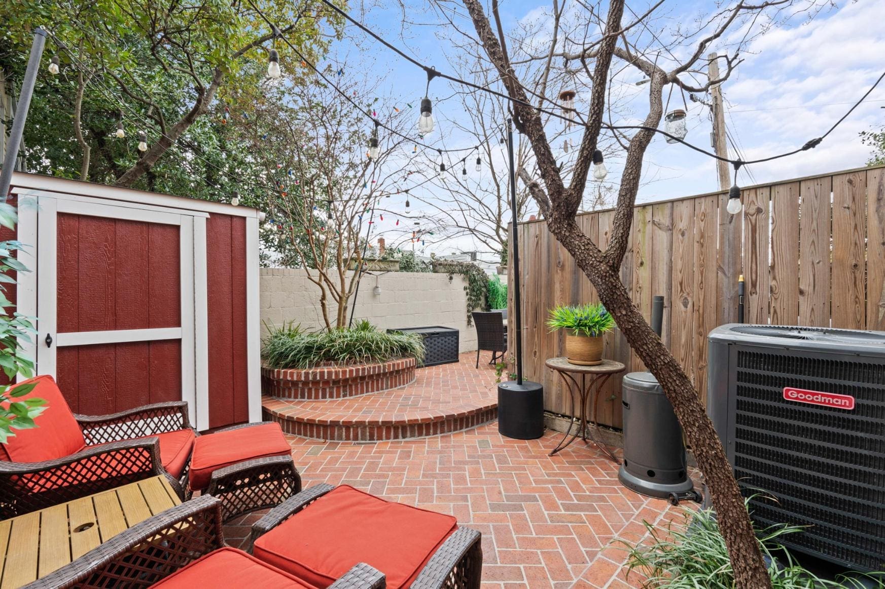 Outside, the owners extended the deep brick patio to include the convenience of coveted off-street parking, all beneath the dappled shade of a gorgeous Crape Myrtle. This private, peaceful spot is perfect for morning coffee or unwinding with friends in the evening. A large weatherproof storage shed adds everyday practicality, while ample street parking—preferred by the sellers—ensures plenty of options for you and your guests.