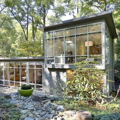 The neighborhood is named for the nearby Hollin Hills Plantation, which was owned by George Mason. This 326-acre community consists of approximately 450 houses built between 1949 and 1971. The midcentury modern homes were designed by architect Charles Goodman, who also designed nearby Reagan National Airport. Renowned modernist landscape architect Dan Kiley worked to ensure the homes blended seamlessly into their woodsy surroundings.