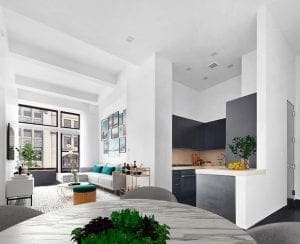 Another is a 2 bed, 2 bath loft in the Flatiron District. This 1200 square foot home features two large bedrooms, a bright and welcoming living room, a separate dining area, an open kitchen and two full bathrooms. It also includes 14 foot ceilings throughout, large windows, and recessed lighting.